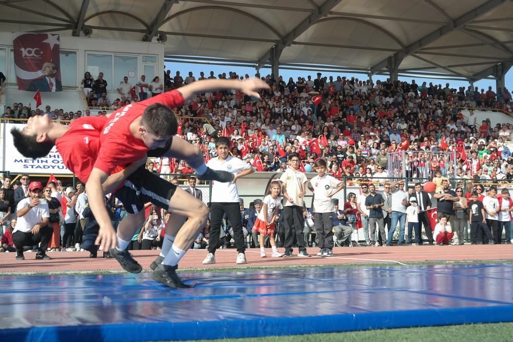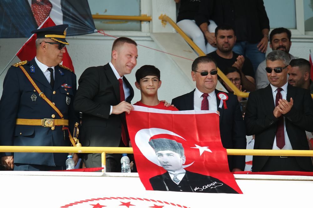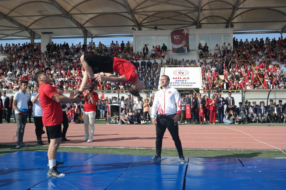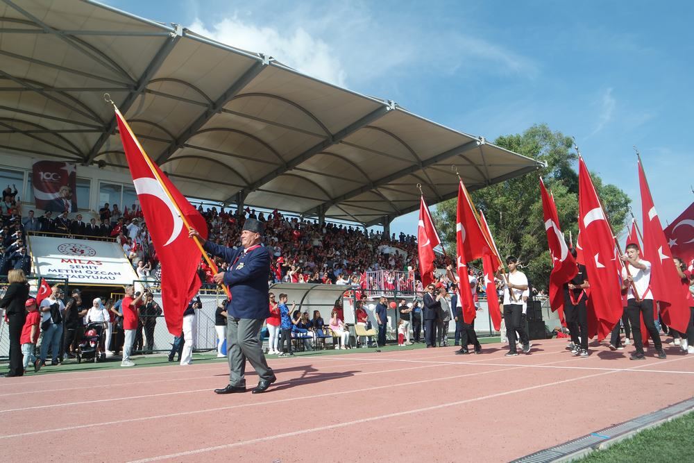 Cumartesi günü Atatürk Anıtı’na Milas Kaymakamlığı, Milas Garnizon Komutanlığı ve Milas Belediyesi çelenklerinin sunulmasıyla başlayan resmi törenin ikinci bölümü bugün saat 09:30’da Kaymakam Mustafa Ünver Böke’nin Kaymakamlık makamında tebrikleri kabul etmesiyle başladı, saat 10’da Şehit Metin Özcan Stadyumunda devam etti.