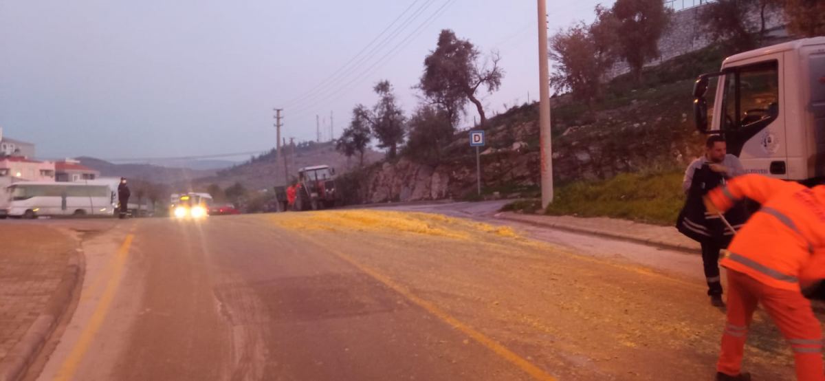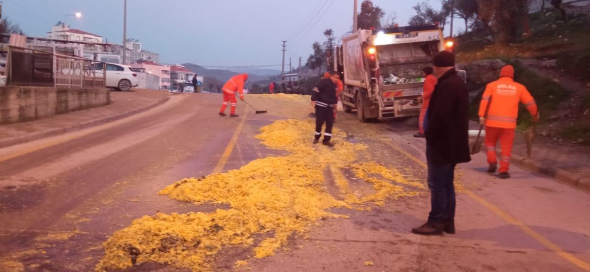 Milas’ın Burgaz Mahallesi Nazmi Akdeniz Caddesi’nde sabah erken saatlerde seyreden bir kamyonun kasasında yüklü meyve püreleri yola döküldü.