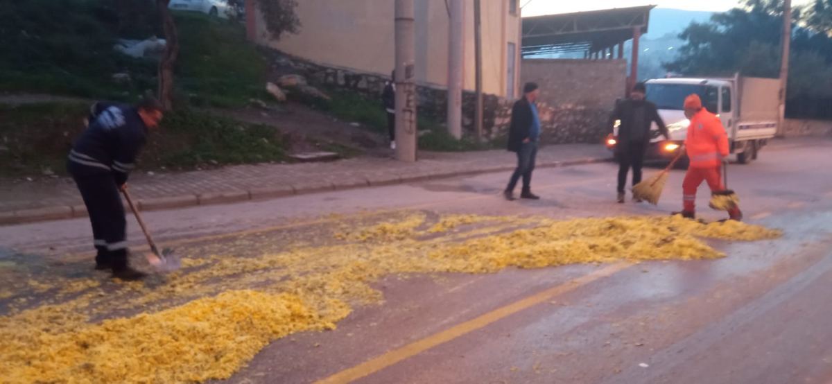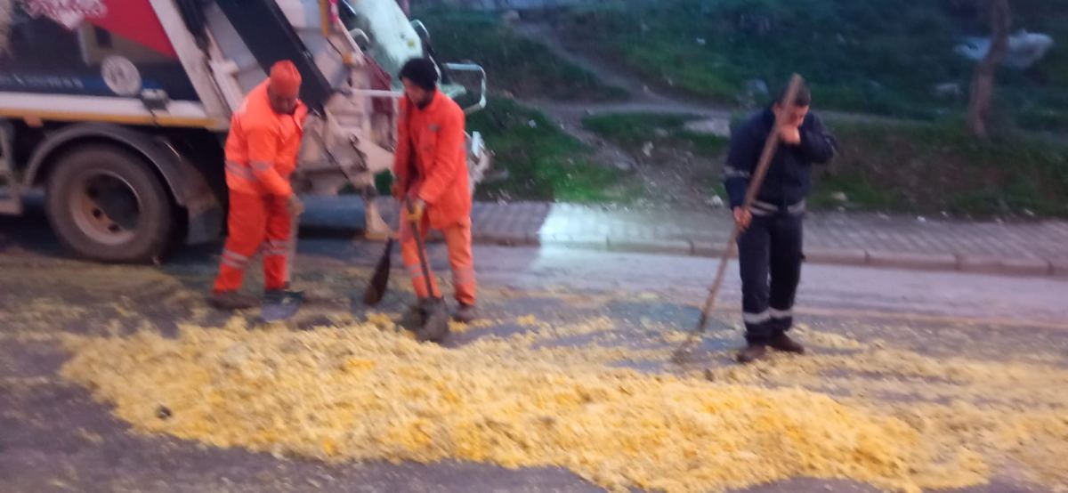 Sürücülerin ihbarı üzerine olay yerine gelen belediye ekipleri temizlik çalışması yaptı. Yapılan çalışmanın ardından yol trafiğe açıldı.