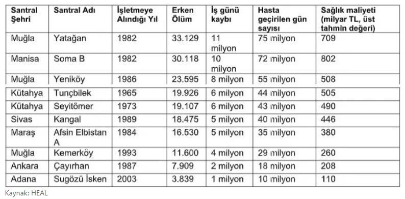 Raporun sonuçlarına göre, 1965-2020 yılları arasında açılan ve halen 16 ilde faaliyette olan kömür santralleri, 4.8 trilyon TL sağlık maliyetinin yanı sıra 117 bin 661 erken doğuma, 1 milyon 247 bin çocukta bronşit vakasına, 62 milyon iş günü kaybına yol açtı.