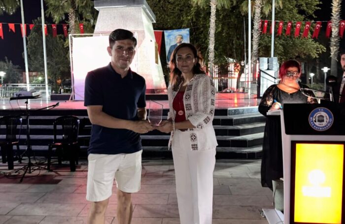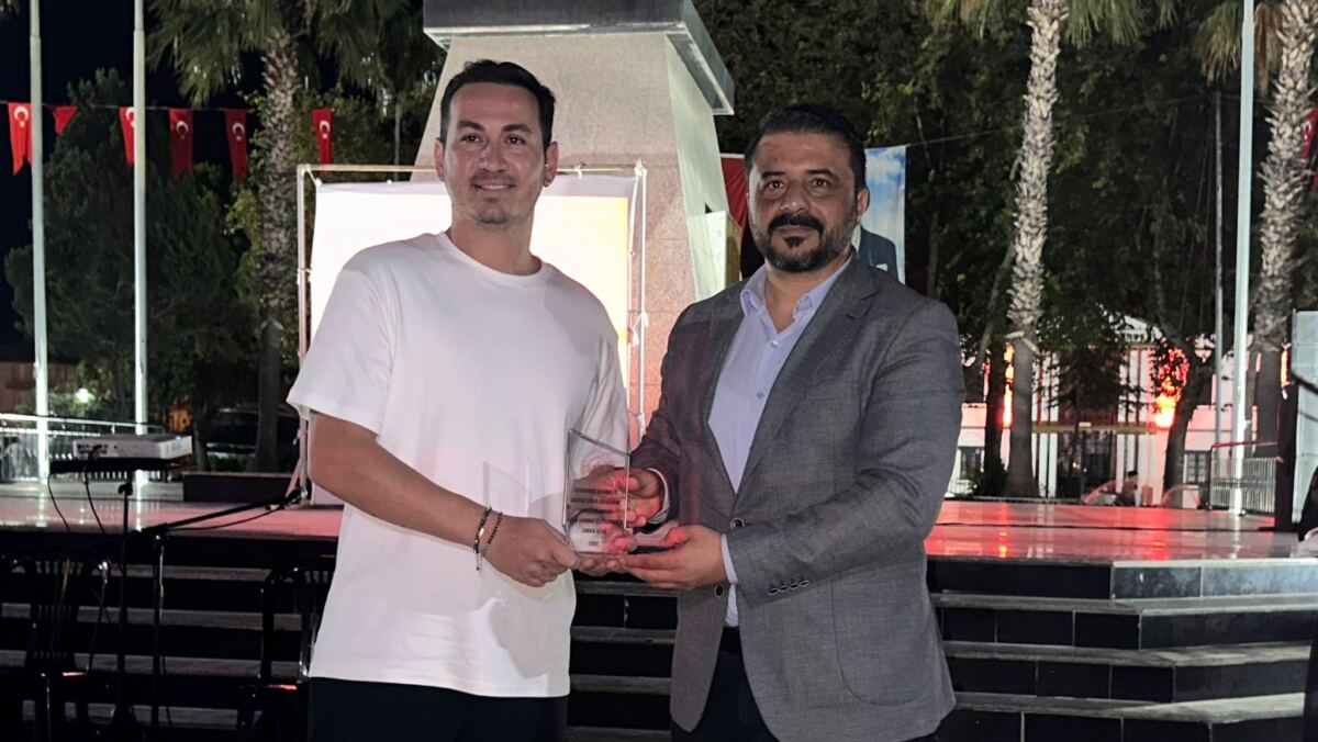 Futbol turnuvasının gol kralı unvanını alan Milas Belediyespor futbolcusu Barış Sabancı’nın ödülünü AK Parti Milas İlçe Başkanı Duygu Pınar Marçalı Doğru verirken, turnuvanın en iyi kalecisi olarak