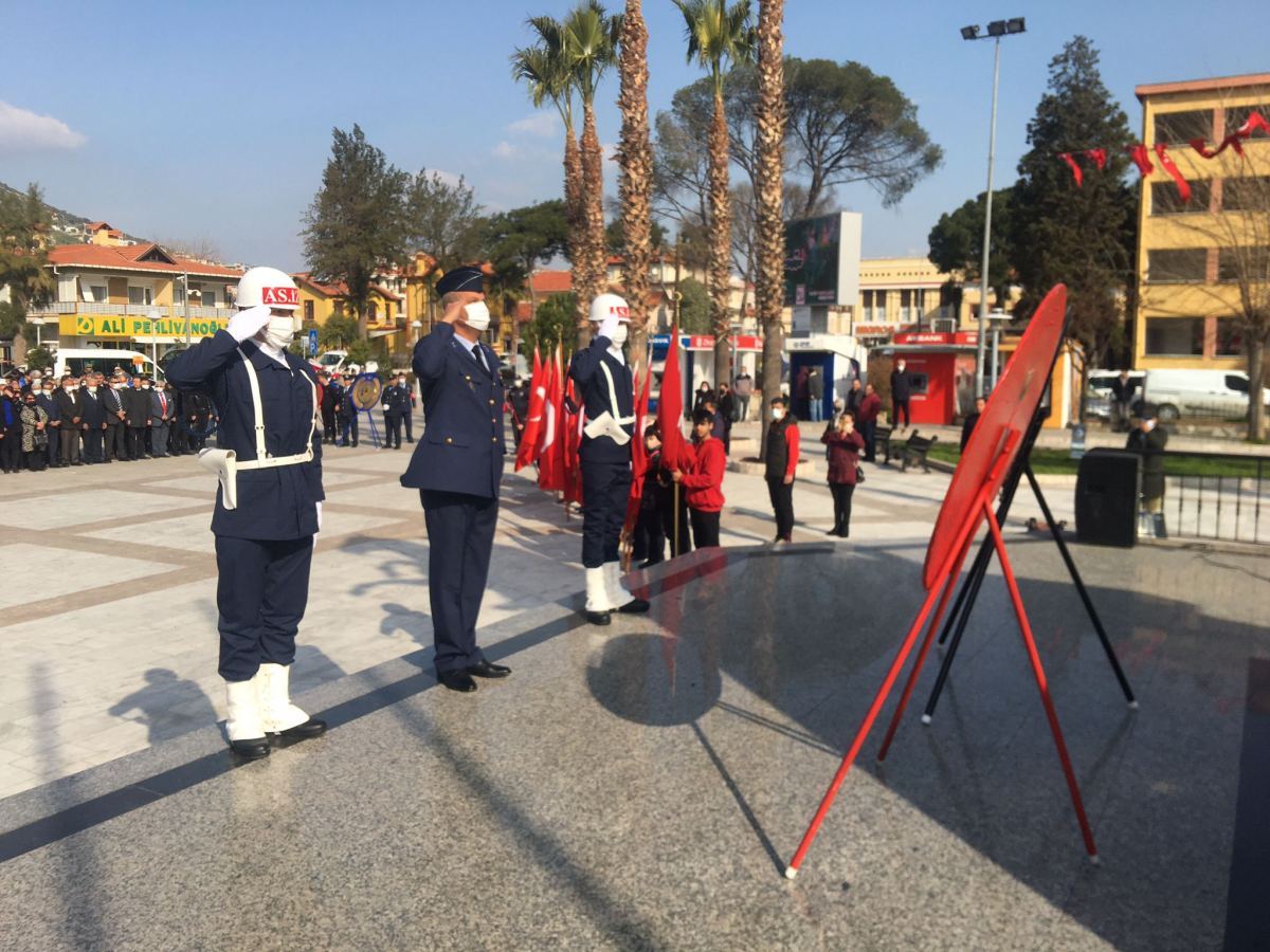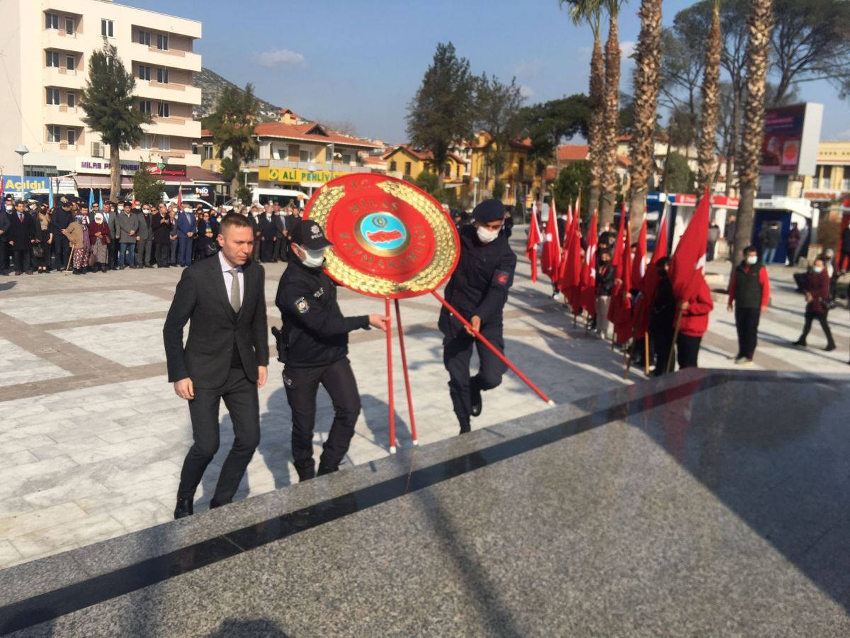 Milas Kaymakamı Mustafa Ünver Böke’nin yanı sıra protokol üyeleri, vatandaşlar ve öğrencilerin katıldığı 18 Mart Çanakkale Zaferi’nin 107. Yılı Çelenk Sunma Töreni çelenklerin Atatürk Anıtı’na sunulması ile başladı.