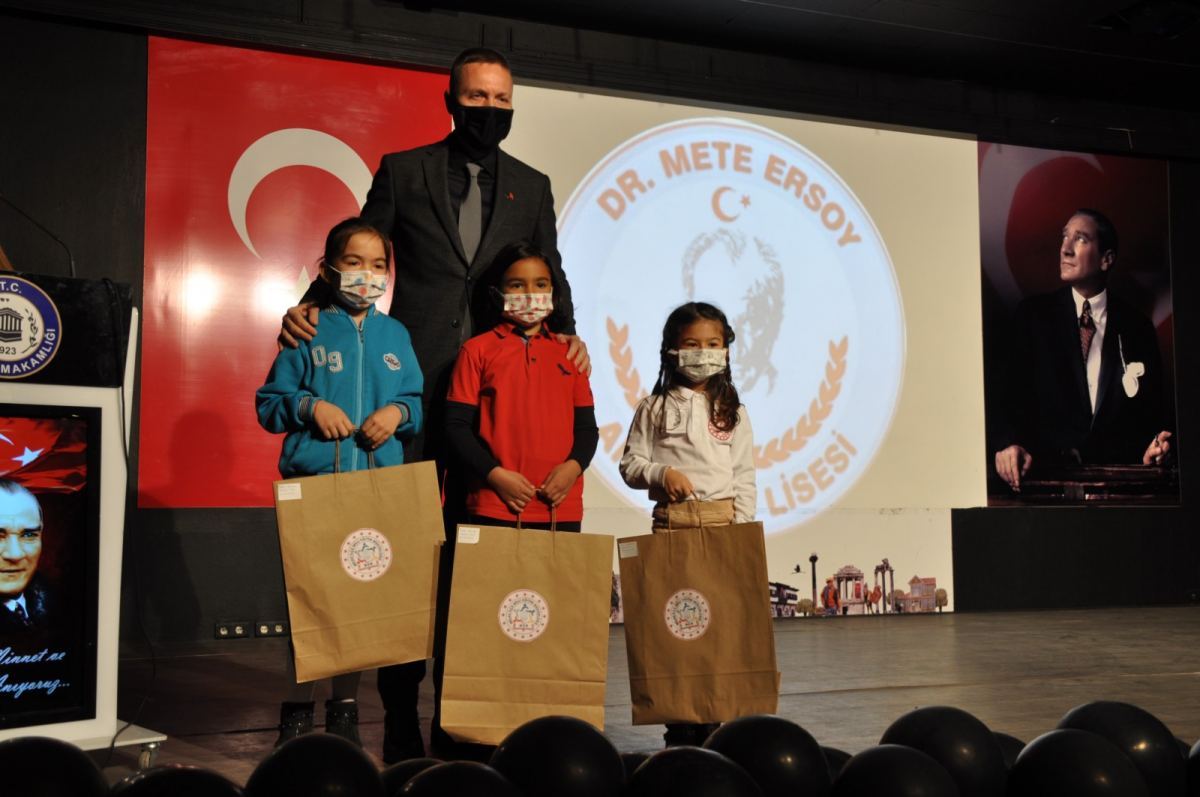 Resim dalında 1. olan Milas Özge İlkokulu’ndan Zeynep Pelin Çoban, 2. olan Özel Milas Sınav Koleji’nden Asya Canikli ve 3. olan Milas Şehit Erkan Karataş İlkokulu’ndan Melis Karakaş’a ödüllerini Kaymakam Mustafa Ünver Böke;