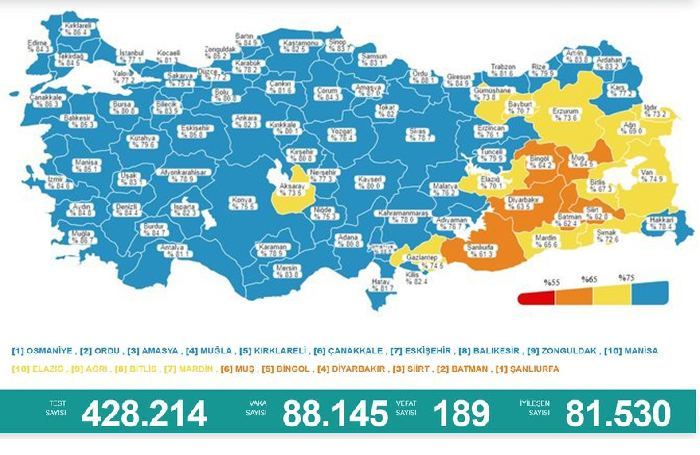 Verilerde, aşılamada önde giden illere de yer verildi. Bakanlığın tablosuna göre yüzde 88,6 ile Türkiye’de en çok aşılamanın gerçekleştirildiği Osmaniye’yi, Ordu, Amasya, Muğla, Kırklareli, Çanakkale, Eskişehir, Balıkesir, Zonguldak ve Manisa takip etti.