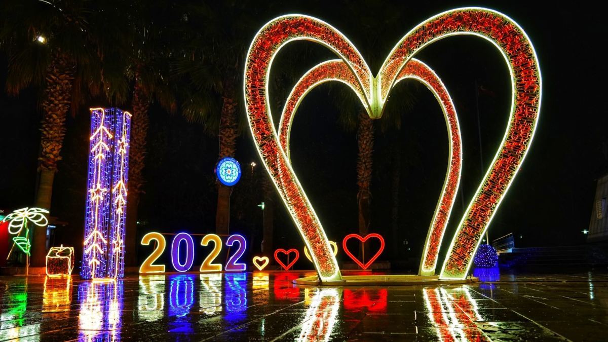 Milas Atapark da, yılbaşı gecesi için 2022 yazısı, ay yıldız, kalp ve yıldız ile renklendirildi.