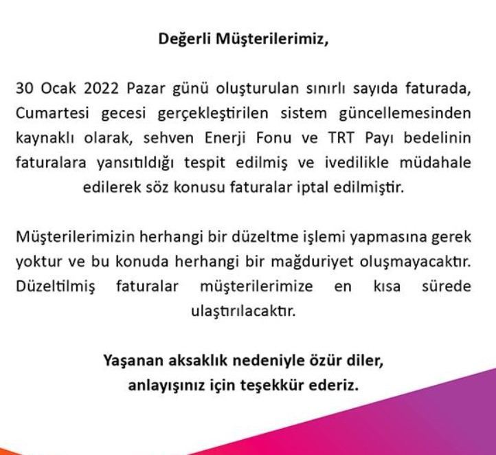 AYDEM A.Ş. ise internet sitesinden yaptığı açıklamada “30 Ocak 2022 Pazar günü oluşturulan sınırlı sayıda faturada Cumartesi gecesi gerçekleştirilen sistem güncellemesinden kaynaklı olarak, sehven Enerji Fonu ve TRT payı bedelinin faturalara yansıtıldığı tespit edilmiş ve ivedilikle müdahale edilerek söz konusu faturalar iptal edilmiştir. Müşterilerimizin herhangi bir düzeltme işlemi yapmasına gerek yoktur ve bu konuda herhangi bir mağduriyet oluşmayacaktır. Düzeltilmiş faturalar müşterilerimize en kısa sürede ulaştırılacaktır” denildi.