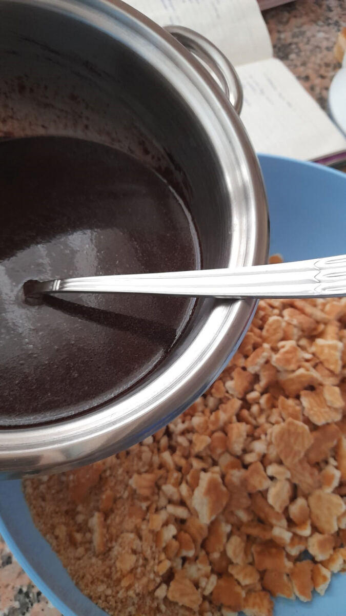 Öncelikle bisküvileri elimizle ufalıyoruz. Daha sonra yarım maket margarini kısık ateşte erittikten sonra içerisine üç yemek kaşığı kakao ekleyip iyice karıştırıyoruz. Diğer malzemeleri de karışımımıza kattıktan sonra tüm malzemeleri birbirine yediriyoruz.