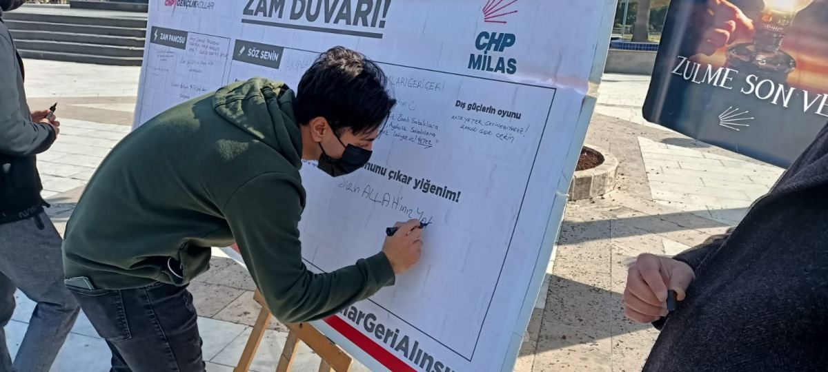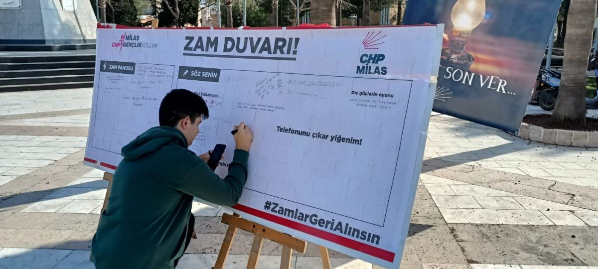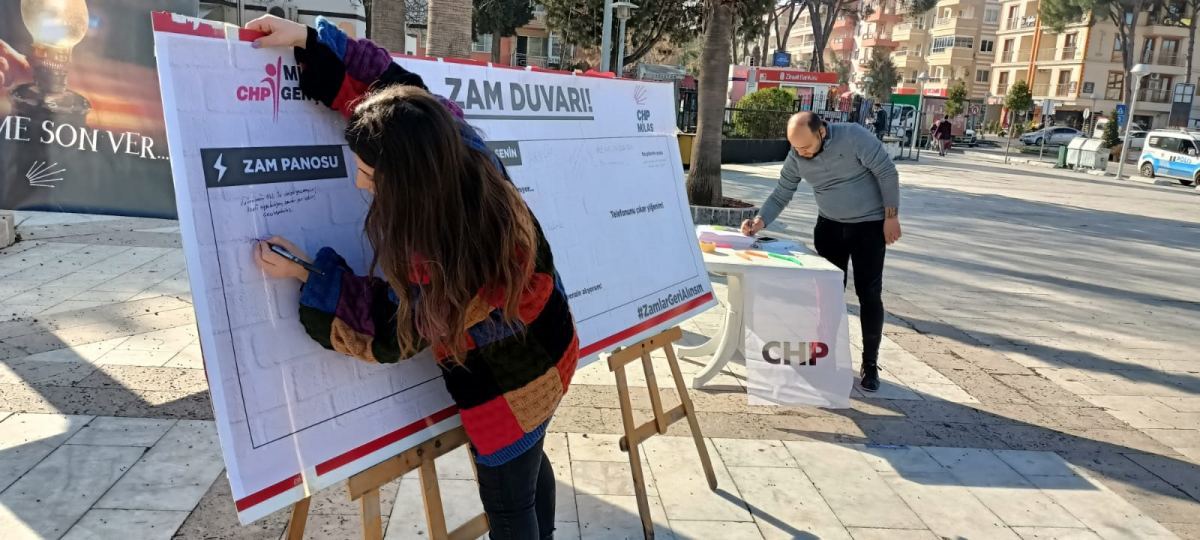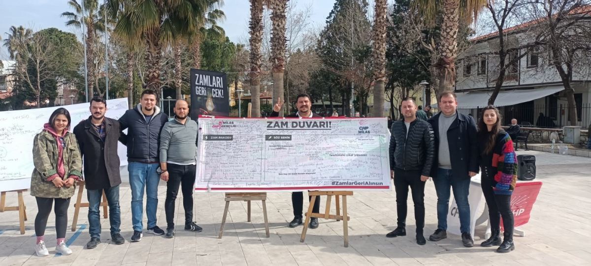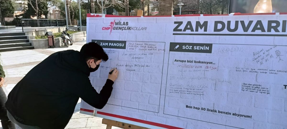 CHP Gençlik Kolları, zamların geri çekilmesi çağrısında bulunmak için 81 il ve ilçe meydanında eş zamanlı olarak saha çalışması başlattı. Çalışmalar kapsamında Milas’ta CHP Milas İlçe Gençlik Kolları Başkanlığı tarafından Atapark Meydanı’nda da Zam Duvarı ve Zam Mektubu panoları açıldı.