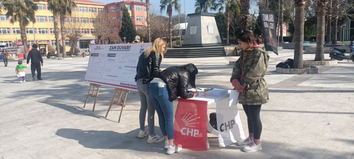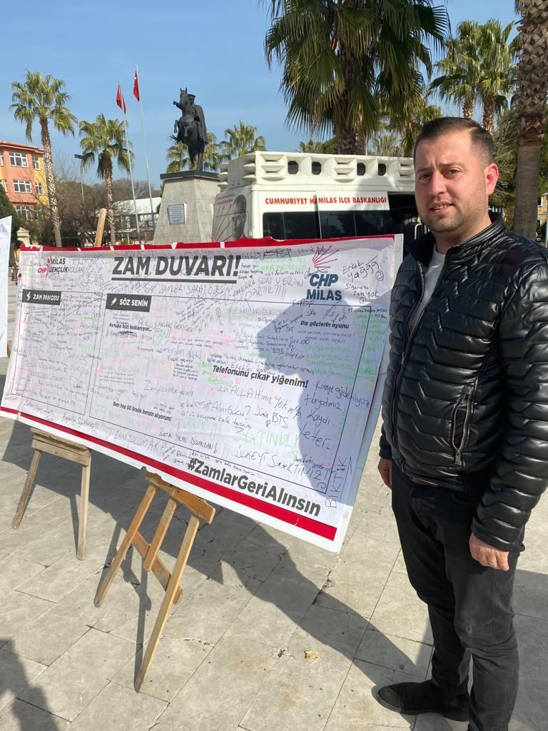 Cumhuriyet Halk Partisi (CHP) Milas İlçe Gençlik Kolları, zamların geri çekilmesi için Milas’ta Atatürk Meydanı’nda ‘Zam Duvarı’ ve ‘Zam Mektubu’ eylemlerine başladı.