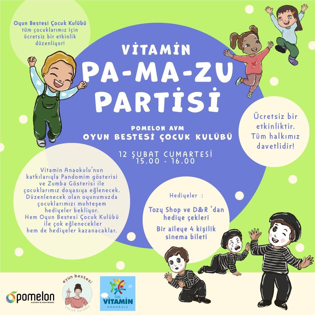 12 Şubat Cumartesi günü 15.00-16.00 saatleri arasında Vitamin Anaokulu’nun katkılarıyla ‘ücretsiz’ olarak düzenlenecek olan Pa-Ma-Zu Partisi’nde çocuklar pandomim ve zumba gösterileri ile doyasıya eğlenip hediye kazanma şansını yakalayacak.