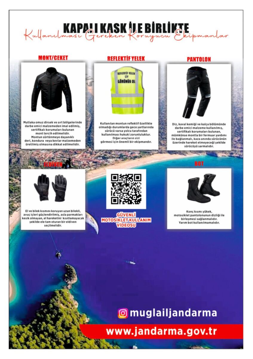 Koruyucu özelliği en fazla olan kask türü olan Kapalı Kask türü ile koruyucu ekipman kullanımının öneminin anlatılması ve farkındalık oluşturulması amacıyla Muğla İl Jandarma Komutanlığınca “Kaskın Kapalı Yolun Açık Olsun” projesi Muğla Valisi Dr. İdris Akbıyık’ın olurları ile uygulamaya başlandı.