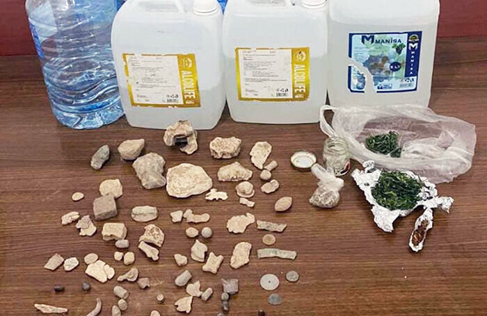Yapılan aramada, bir miktar kurutulmuş esrar, bir miktar kenevir tohumu, 42 litre etil alkol ve 50 parça eski döneme ait olduğu değerlendirilen taş parçaları ele geçirildi.