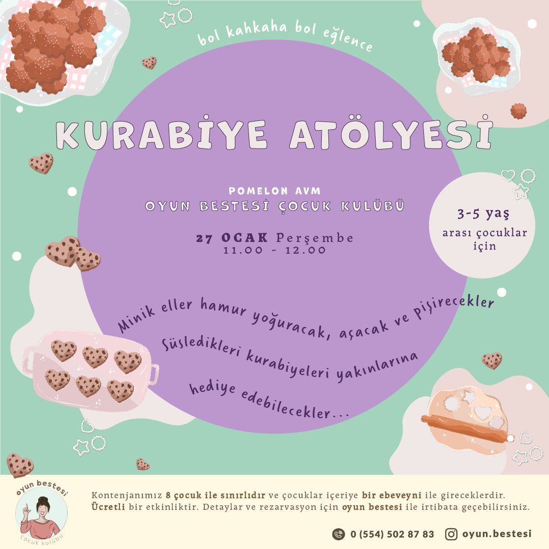 Pomelon AVM’de hizmet vermeye başlayan Oyun Bestesi Çocuk Kulübü 27 Ocak Perşembe (yarın) günü 11.00-12.00 saatleri arasında 3-5 yaş grubuyla kurabiye hazırlayıp pişirecek. Minik eller sonrasında kendi yaptığı kurabiyeleri tadacak, yakınlarına ikramda bulunacak.