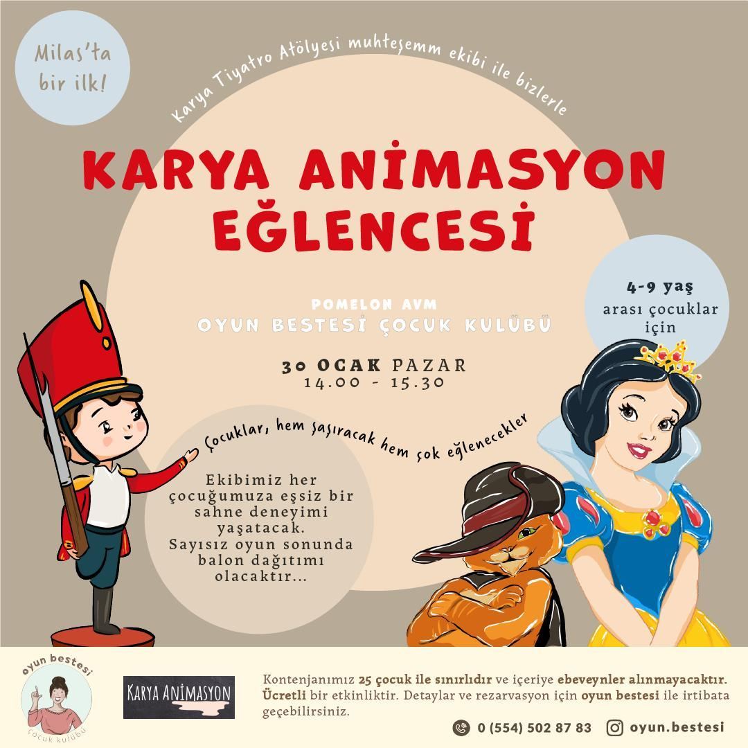 30 Ocak Pazar günü 14.00-15.30 saatleri arasında çocuklar Karya Tiyatro Atölyesi’nin katkılarıyla Kurşun Asker, Pamuk Prenses ve Çizmeli Kedi ile birlikte sahne alma fırsatını yakalayacak, animasyon gösterileri ile eğlenceli bir gün geçirecek.