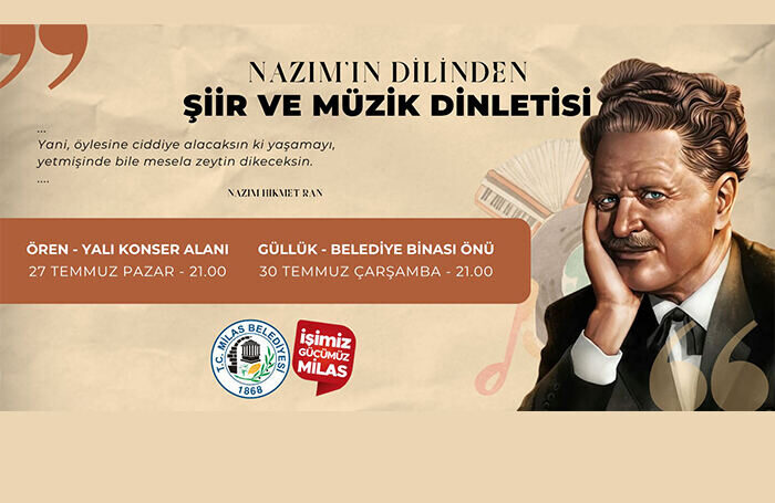 Nazım Hikmet Ran’ın hayatının anlatılacağı, şiirlerinin yorumlanacağı ve bestelenmiş şiirlerinin dinletisinin sunulacağı ‘Nazım Hikmet’i Anma Gecesi’ Ören Mahallesi’nde 27 Temmuz Pazar günü saat 21.00’de Yalı Konser Alanı’nda, 30 Temmuz Çarşamba günü ise Güllük’te saat 21.00’de Belediye Binası Önünde gerçekleşecek.