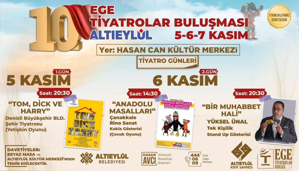 10. Ege Tiyatrolar Buluşması’na ev sahipliği yapacak Altıeylül Belediye Başkan Hasan Avcı ise buluşma için “Üç gün boyunca tiyatro gösterileri, söyleşiler, atölyeler, çocuk tiyatroları ile kentimizin her köşesinde sanata doyacak, tiyatronun ustalarını kentimizde ağırlayacak ve şehrimizi tanıtacağız. Kapalı ve açık oturumların olduğu bu büyük buluşmada siz değerli sanatseverlerimizle tiyatro sanatçılarımızı buluşturacağız” dedi.