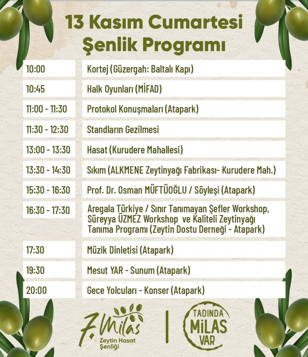 “Tadında Milas Var” sloganıyla bir yıl aranın ardından 13 Kasım Cumartesi günü saat 10.00’da kortej yürüyüşüyle açılışı yapılacak olan Zeytin Hasat Şenliği, halk oyunları gösterileri, protokol konuşmaları ve stantların gezilmesi ile devam edecek.