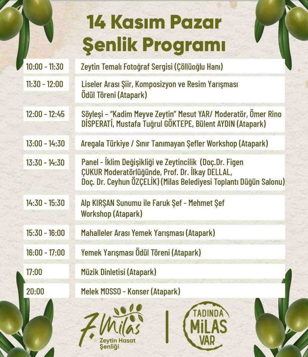 Milas’a yakışacak dolu dolu bir program ile gerçekleşecek olan Zeytin Hasat Şenliği’nin 14 Kasım Pazar günkü bölümünde ise fotoğraf sergisi, ödül töreni, söyleşiler, yemek yarışması, müzik dinletisi gibi birbirinden keyifli etkinlikler yer alacak.