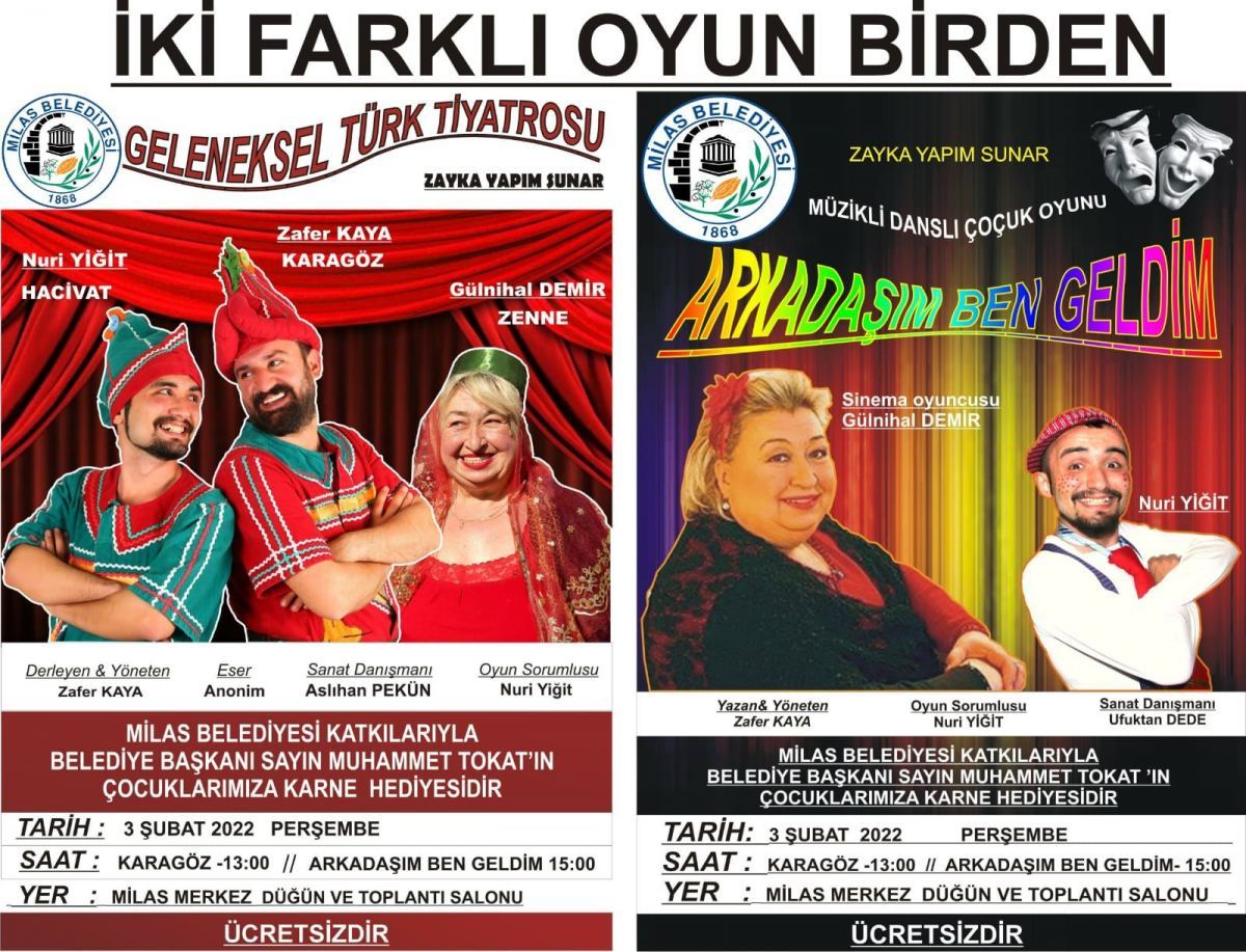 İlk olarak 1 Şubat Salı günü saat 13.00’te Geleneksel Türk Tiyatrosu oyunu Karagöz, saat 15.00’te ise müzikli danslı çocuk oyunu Arkadaşım Ben Geldim Güllük Belediye Kapalı Toplantı ve Düğün Salonu’nda izleyicilerle buluşacak.