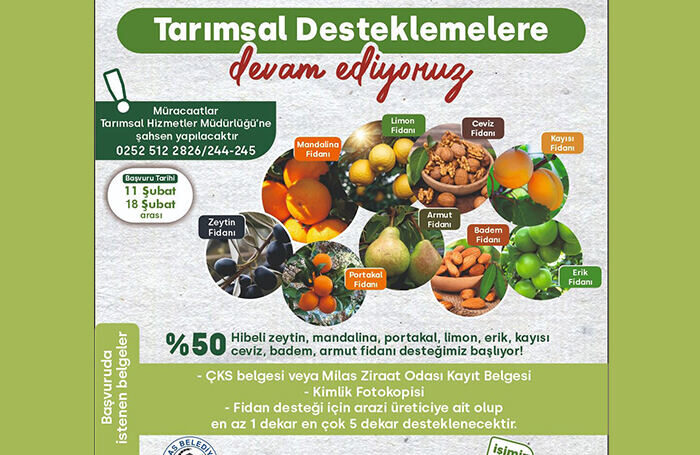 Tarımın güçlenmesi ve artan maliyetler karşısında üretim yapmakta zorlanan çiftçilerin yanında olan Milas Belediyesi talepte bulunan ve uygun şartları sağlayan üreticilere yüzde 50 hibeli zeytin, mandalina, portakal, limon, erik, kayısı, ceviz, badem ve armut fidanı desteğinde bulunacak.