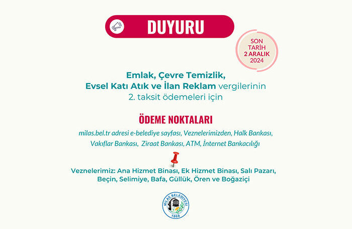 2024 yılı Emlak Vergisi, Çevre Temizlik Vergisi, İlan-Reklam Vergisi ve Evsel Katı Atık Ücretinin ikinci taksitleri www.milas.bel.tr adresinden kredi kartı ile, Milas Belediyesi Ana Hizmet Binası, Ek Hizmet Binası, Güllük, Bafa, Selimiye, Ören, Beçin ve Salı Pazarı’ndaki ödeme merkezlerinden nakit veya kredi kartı ile veya Milas Belediyesi’nin internet sitesinde belirtilen bankaların IBAN adreslerine gönderilerek yapılabilecek.